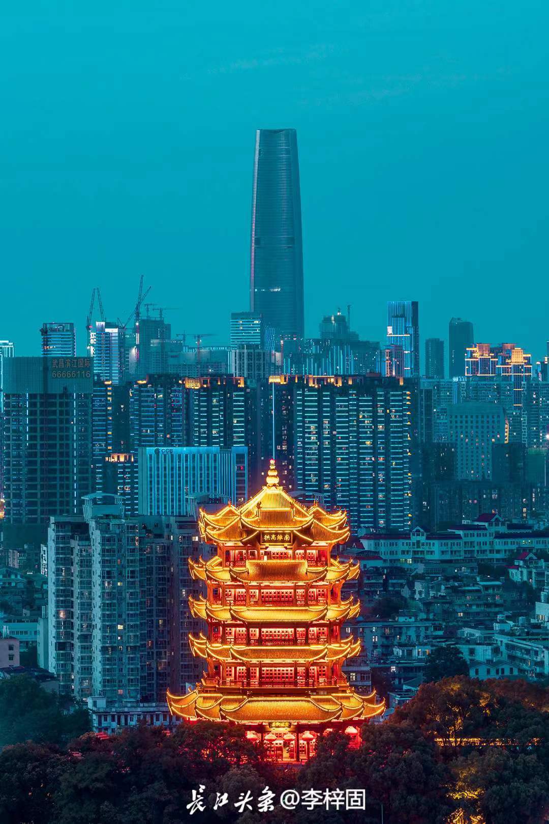 千古名楼黄鹤楼与华中第一高楼武汉绿地中心大厦同框。长江头条@李梓固 摄