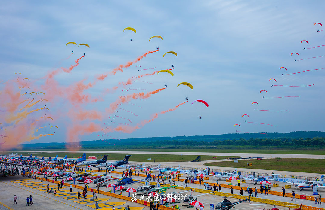 在汉南通用机场举行的世界飞行者大会上,正在进行动力伞飞行表演。长江头条@韩昶光 摄