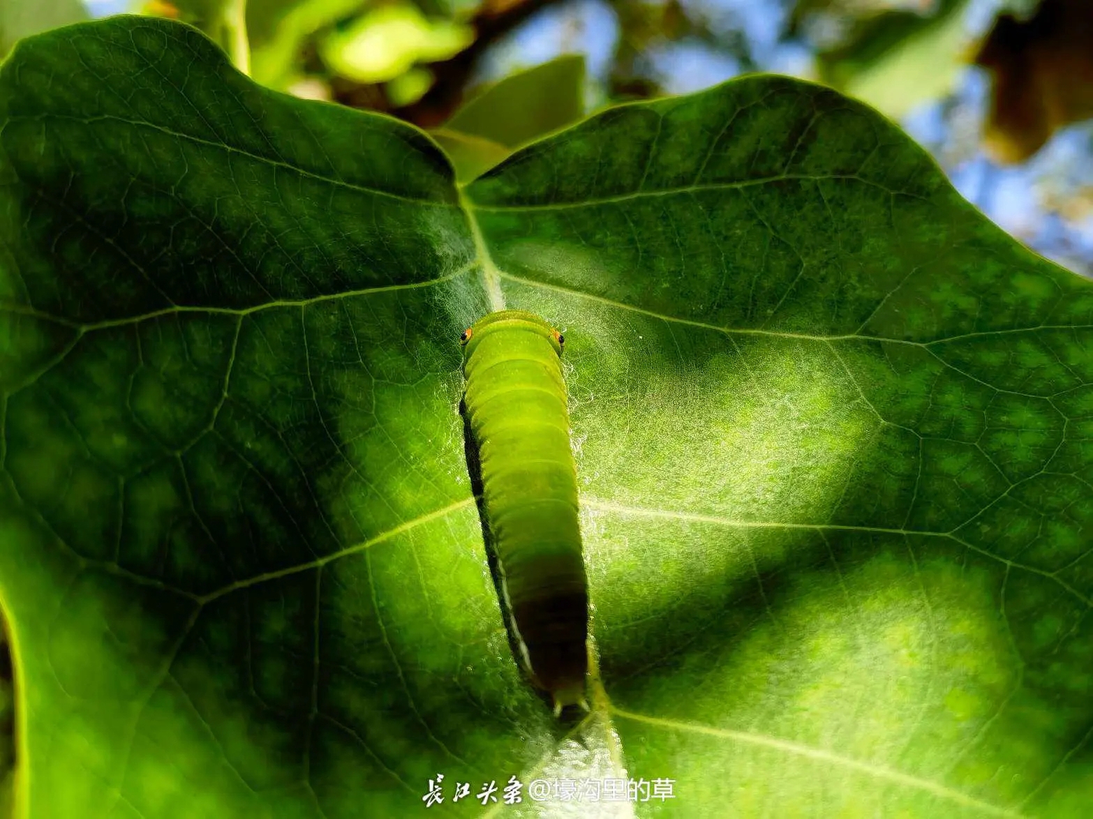 秋天,华中农业大学校园里,一片鹅掌楸的叶子上,凤蝶幼虫躲在叶子中间,一动也不敢动,憨态可掬。长江头条@壕沟里的草 摄