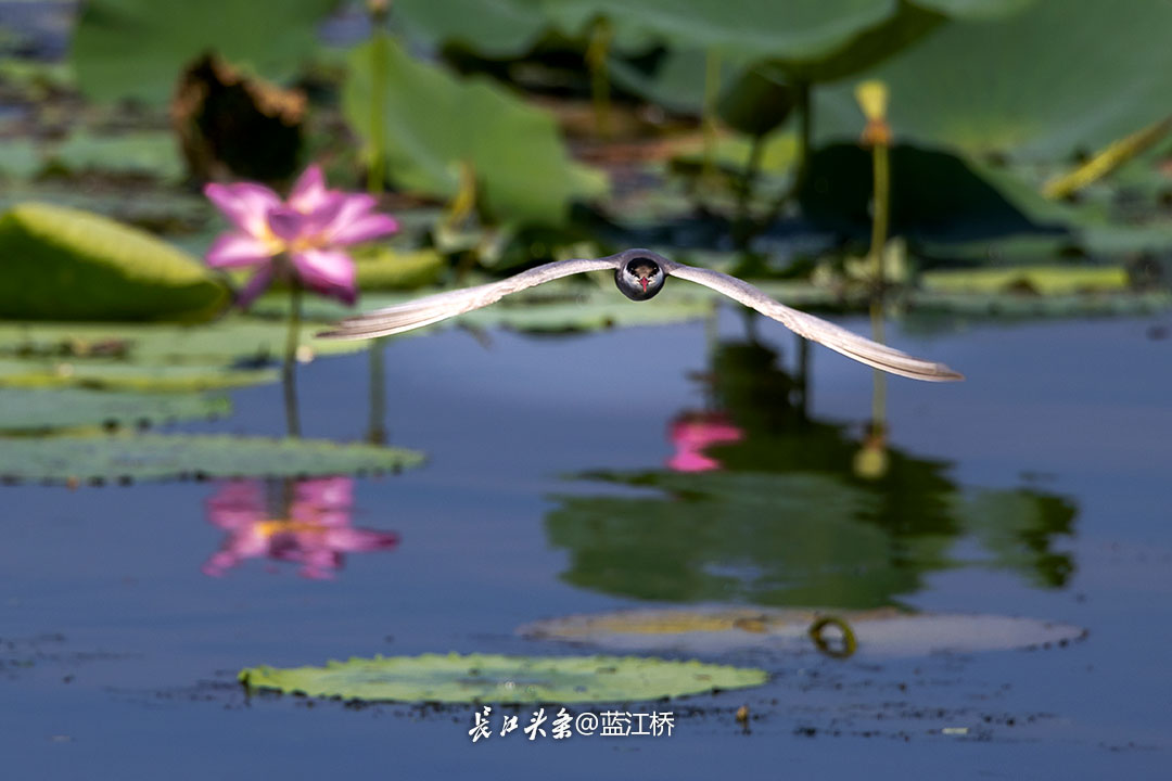 盛夏之际,东西湖区柏泉街道龙王沟,须浮鸥在荷塘里穿行,为即将诞生的小宝宝衔枝筑巢。长江头条@蓝江桥 摄