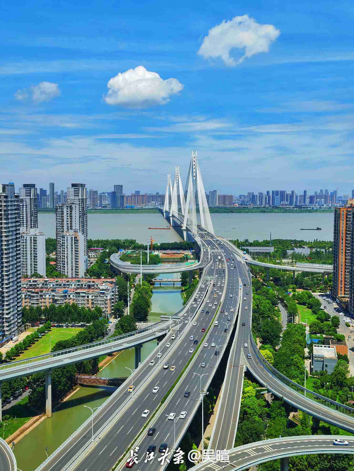 两朵好似棉花糖的白云慢慢飘过二七长江大桥的上空。长江头条@吴暄 摄
