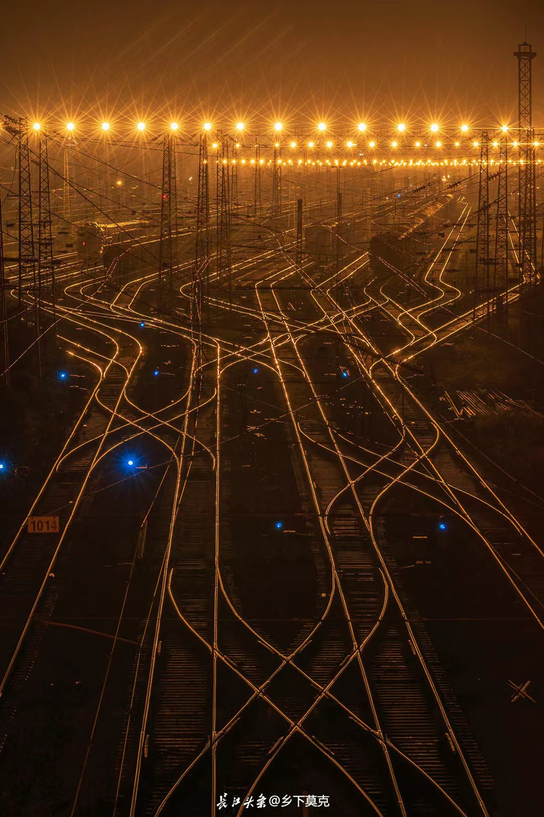 黄陂区横店铁路编组站的车轨在灯光的照摄下,形成一组组光网,几辆货运列车有序排列,等待着驶向全国各地。长江头条@李梓固 摄