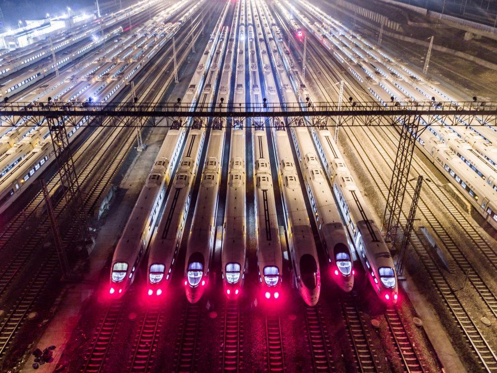 高铁“万箭齐发”势如“陆地航母” 2017-01-27 08:54 来源: 中国青年网 调整字体 2017年1月26日,江苏南京,每天晚上12点后,所有的动车都要入库检修,以保障着春运的安全。航拍下的南京动车库霸气十足,高铁“万箭齐发”势如“陆地航母”,整齐地停靠在库内,迎战春运大考。