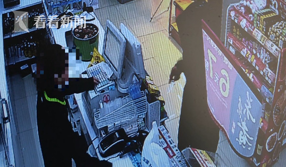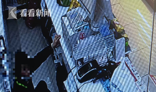 监控画面中,嫌犯付某穿着连衣帽,故意将面部遮挡起来,意图让监控探头拍摄不到他的面部。他假装在这家位于唐镇路上的便利店内挑选商品,随后走到收银台处露出狰狞面目,掏出匕首威胁女店员井某打开收银机。