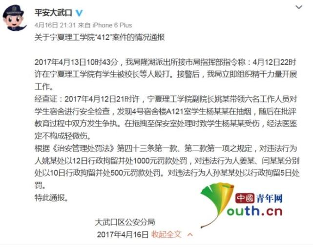 4月14日晚,宁夏理工学院通过官方微博@宁夏理工微博协会 发布通报称,4月12日晚10时,宁夏理工学院领导分别带队例行检查学生宿舍,姚远副校长等人在经济管理学院学生宿舍看到学生抽烟,当即叫学生掐灭烟头,看到杨某某耳朵有一片近似香烟的东西,别在那里,以为是香烟,就用手去帮学生取下,引起学生误会,并用手拨开了姚校长的手,随行人员当即叫学生去办公室写检查,学生不愿意去,双方都在气头上,推推嚷嚷中,发生肢体碰撞,事发后将学生送医检查。