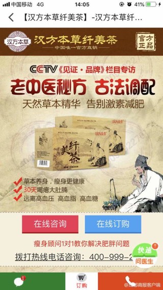 由于从没在网络上购买过商品,刘芳十分谨慎,搜索了该产品的官方网站。正浏览着网页,页面中弹出了在线咨询栏,刘芳便顺便咨询了一下产品。随后,在产品客服人员的引导下,她添加了对方所称的汉方本草纤美茶官方微信号,并与客服人员进一步询问了解。