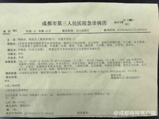 经过医院救治,刘芳脱离了危险,成都商报记者从医院的急症病例上看到,在“急诊处理”一栏上,医生注明了病危、心肌三联检测、心肌钙蛋白T定量测定、头部(脑)CT平扫等,临床诊断结果显示:消化道损伤?(注:问号不能删)随后,转入消化科入院进行治疗。