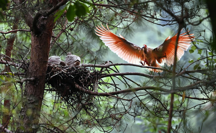 在陕西省洋县溢水镇老庄村一处朱鹮巢点,成鸟觅食归来。新华社记者陶明 摄