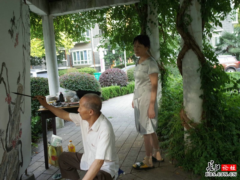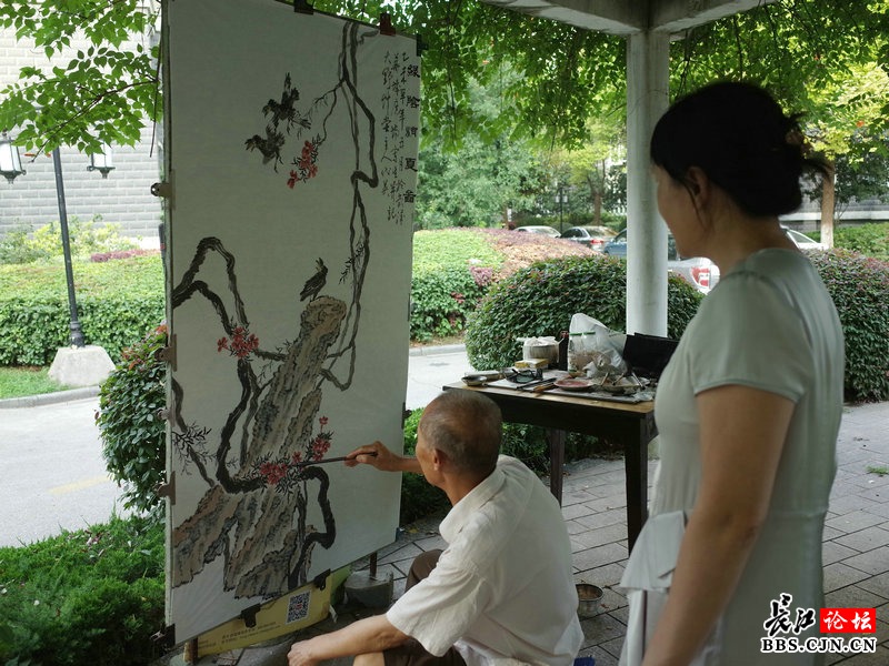 (长江网i记者 土豆先生)洪山华城广场70岁的叶代英先生,在小区内挥毫作画,其忘我投入的精神吸引了不少居民驻足观看。据介绍,叶先生一生酷爱画国画,曾有作品在老武汉展览馆展出,他几乎天天拉开架势,在小区或公园,用巨大的宣纸写生作画,他希望在有生之年出版一本花鸟画集。