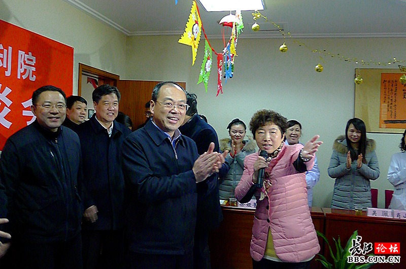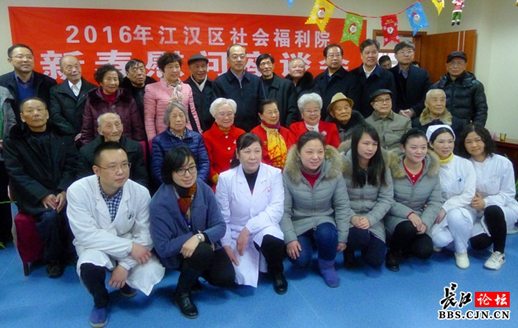 2月4日下午,湖北省委常委、武汉市委书记阮成发在副市长刘立勇和市区相关部门主要负责人陪同下来到江汉区福利院暨老年公寓。他边走边看,认真听取了院长的情况汇报,对该院2015取得的骄人业绩赞誉有加,希望2016继续努力,当好全国养老行业的排头兵。随后,他来到护理区看望慰问高龄老人,仔细了解老人们的生活学习情况,给老人们送来新春祝福及慰问金,让老人们感受到党和政府的亲切关怀和温暖。103岁的老人王文兰,93岁的戴静予老人都收到领导赠送的压岁红包。王文兰老人还即兴给领导们清唱了一段京剧,现场笑声.喝彩声阵阵,气氛十分祥和欢乐。慰问活动中,阮书记还向福利院赠送了慰问金,看望慰问了“三无”老人和职工代表,与他们合影留念。武汉市民政局局长罗时春、江汉区委书记干小明、区长张俊勇、副区长周岚也随同看望了老人。
