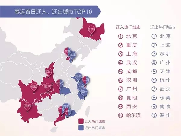 人们通常认为,春节期间,一线城市打拼的青壮年都会纷纷返乡,致使北上广等地上演“空城计”。但迁徙大数据显示:春运以来的每一天,北京、上海都位列迁入城市前10名。